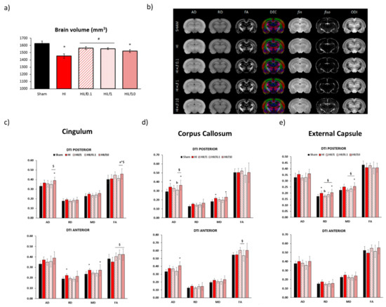 MRI data at P25. Left upper panel (a)—brain volumes (mm3) (n = 5–8 animals/group). Right upper panel (b)—Diffusivity (mean, MD; axial, AD; radial, RD), fractional anisotropy (FA) and direction encoded colour (DEC) maps, intra-neurite volume fraction (fin), cerebrospinal volume fraction (fiso), and orientation dispersion index (ODI) maps. Maps correspond to the averaged maps over each group. Lower panels: histogram of diffusivities (mean, MD; axial, AD; radial, RD; ×10−4 mm2·s−1) and fractional anisotropy (FA) in the cingulate gyrus (left panels—c), corpus callosum (central panels—d) and external capsule (right panels—e). Results are mean ± SD. * HI vs. SH, $ difference between HILf groups. a b HILF0.1, or 1 vs. HI, respectively. Differences were determined by one-way ANOVA and considered significant when p < 0.05 (n = 5–8 animals/group).