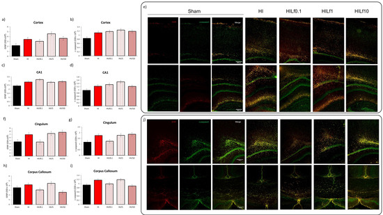 At P25, forebrain volumes were assessed using T2W images. HI and HILf10 had smaller volumes compared to Sham animals (F(4,36) = 6.661, p < 0.001) evidencing the tissue preservation using 0.1 and 1 g/kg doses (Figure 4a). The maps of brain diffusivities (Mean, MD; Axial, AD and Radial, AD), fractional anisotropy (FA) are presented in Figure 4b. NODDI-derived parameters, such as intra-neurite volume fraction (fin), cerebrospinal volume fraction (fiso), and orientation dispersion index (ODI) are presented in Figure S2. These parameters represent a good evaluation of microstructure integrity. High signal-to-noise ratio and very good resolutions were obtained leading to accurate measurement of the DTI and NODDI derived parameters, similar to those previously reported [42]. In the motor cortex, fiso was decreased in the posterior region of the motor cortex in the HI and HILf1 groups compared to Sham (H = 11.22, p = 0.02) (Figure S2). In the somatosensory cortex, no significant differences in the microstructure were observed (Figure S2). In the Cingulum, (Figure 4c—left lower panels) the HILf10 group showed increased AD (F(4,36) = 2.63, p = 0.05) and FA (F(4,36) = 2.80, p = 0.04) in the posterior region of the brain compared to the Sham group (F(3,17) = 3.44, p = 0.04). Moreover, in the posterior cingulum, FA was increased in the HILf10 group. The HI group presented an increase in RD and MD in the anterior region of the cingulum ((F(4,36) = 3.26, p = 0.02) and (F(4,36) = 2.63, p = 0.05), respectively). MD was also increased in the HILf10 group. Despite demonstrating no difference with Sham group, all HI treated groups displayed increased FA compared to the HI group in the anterior region of the cingulum (F(4,36) = 3.41, p = 0.02). No significant differences were observed in the internal capsule (Figure S2). In the caudate putamen, an increase in FA in groups HILf1 and HILf0.1 was observed ((F(4,36) = 3.25, p = 0.02) (Figure S2). One-way ANOVA performed in the posterior region of the corpus callosum (Figure 4d—central lower panels), showed an increase in AD in the HI and HILf10 g/kg groups ((F(4,36) = 3.74, p = 0.01). HILf0.1 had decreased FA in the anterior region of the CC compared to HILf1 and HILf10 (F(4,36) = 2.77, p = 0.04). In the anterior region of CC, AD, and MD were increased only in HILf10 animals (F(4,36) = 3.09, p = 0.02) and F(4,36) = 3.36, p = 0.01, respectively). In the external capsule, no differences were observed in the anterior region (Figure 4e—right lower panels). However, in the posterior region of the structure, MD and RD were increased in the HILf10 group ((F(4,36) = 2.84, p = 0.04) and (F(4,36) = 3.52, p = 0.01), respectively) and unchanged in HILf0.1 and HILf1 groups.