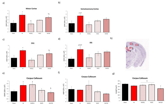 Effects of Lf and HI on brain tissue at P25. Optical density intensity (ODI) of astrocytes (GFAP) in the motor cortex (a), somatosensory cortex (b), CA1 (c), dentate gyrus (d), and corpus callosum (e). Assessment of myelination (MBP) and thickness (f,g) of the corpus callosum CC using 30 µm brain slices at the dorsal hippocampus level. Representative image of the brain regions assessed (h). Scale bar 100 µm. * HI vs. SH, $ difference between HILf groups. a HILf0.1 vs. HI, respectively. Differences were determined by one-way ANOVA and considered significant when p < 0.05 (n= 3–5 animals/group).
