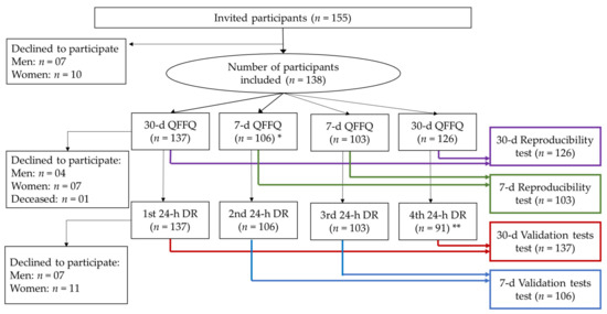 The food intake was assessed using the 30-day FG-QFFQ at the first and fourth visits, and the 7-day FG-QFFQ evaluated the intake at the second and third weeks. A 24-h dietary recall was applied in each of the four assessment sessions. We also assessed the time spent administering the 30-day FG-QFFQ, the 7-day FG-QFFQ, and the 24-h dietary recalls. In total, 137 participants responded to at least one of the 30-day FG-QFFQs and one of the 24-h dietary recalls, and 106 participants responded to the 7-day FG-QFFQ (Figure 1). The first 28 participants responded to the 30-day FG-QFFQ and 3 24-h dietary recalls, while 103 participants responded to 2 7-day FG-QFFQs, and 91 responded to the 4th 24-h dietary recall. Three participants had the assessment sessions rescheduled because of atypical food intake, increasing the average interval between evaluation sessions: one participant underwent a dental procedure, and two participants reported fasting for blood tests. Among the 138 participants, 91 completed all of the assessment sessions. The participants who declined to continue reported difficulties attending scheduled sessions, even by telephone. One participant died during the study.