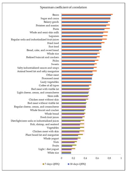 The average correlation between the FG-FFQ and the 24-h dietary recall was 0.45 for both the 30-day and the 7-day FG-FFQ, but it was not similar for all of the items. In the 30-day FG-QFFQ, the correlations were higher than 0.70 for processed meat (r = 0.72); white bread, cake, and sweet bread (r = 0.78); whole bread (r = 0.81), light cheese, cream, and cream cheese (r = 0.76); and animal-based fat and salted margarine (r = 0.74). The correlation between the intake of white, whole bread, and animal fat food groups was lower in the 7-day FG-QFFQ (r = 0.55, r = 0.62, and 0.66, respectively). Moderate correlations (from 0.40 to 0.69) were found for most food items in both the 30-day and 7-day FG-QFFQ, such as sugar and cocoa, sweets, bovine meat without visible fat, white rice, brown rice, refined biscuit or cracker, whole biscuit, or cracker, regular soda and industrialized juices, nuts, light or diet yogurt, whole and semi-skim milk, regular cheese, cream, and cream cheese, fried foods, vegetable fat and unsalted margarine, fruits, and leafy vegetables. For the data collected with the 7-day FG-QFFQ, a moderate correlation was found for pasta, bread, cake, sweetbread, beans, whole yogurt, pickles, animal fat and unsalted margarine, fruits, and fresh fruit juices. Lower correlations were found for bovine meat with visible fat, chicken with skin, chicken without skin, other meat, fish, shrimp, seafood, pasta (only for the 30-day FG-QFFQ), salty industrialized sauces and soups, regular soda and industrialized juices, bakery goods, fast foods, beans (in the 30-day FG-QFFQ only), legumes, whole yogurt (in the 30-day FG-QFFQ only), skim milk, pickles (in the 30-day FG-QFFQ only), vegetable fat and salty margarine (in the 7-day FG-QFFQ only), potatoes and manioc, fresh fruit juices (in the 30-day FG-QFFQ only), vegetables, and leafy vegetables (in the 7-day FG-QFFQ only).