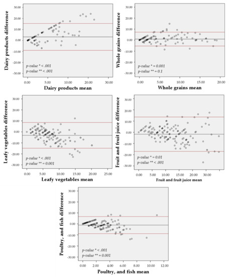 We assessed three aspects of the validity and reproducibility of both FG-QFFQs: overall validity, internal validity, and reproducibility. The overall validity was tested using a partial correlation coefficient adjusted for sex and age, comparing the average intake of two 30-day and two 7-day FG-FFQs with the average intake of the four 24-h dietary recalls. The internal validity of the 30-day and the 7-day FG-QFFQ was tested, assessing the Cronbach’s alpha generated by the intra-class correlation coefficient. To assess the global internal validity, the target of the global Cronbach’s alpha was set at 0.70. To reach a global Cronbach’s alpha of 0.70, we excluded food items or food groups that had a Cronbach’s alpha below 0.01 until the point when the global Cronbach alpha was higher than 0.70. Four statistical models were performed until the target was reached. The reproducibility was tested using the Spearman correlation coefficient comparing the first and second 30-day FG-FFQ and 7-day FG-FFQ. The Bland–Altman method was used to determine whether there was a systematic difference between the 30-day FG-FFQ and the 7-day FG-FFQ compared to the 24-h dietary recall, and whether there was an acceptable agreement between the methods. The assessment of the plotting difference between the methods was compared against the average [34]. Statistical analyses were performed using the SPSS software.