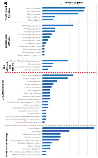In order to more clearly define how the sEHI modulated the response of hippocampal microvessels to an HGD, we used two-factor analysis to identify the DEGs with a significant interaction between the effects of the diet and the effects of the inhibitor. For this analysis, the LGD+sEHI group was included as it was necessary to use this additional control group for the two-factor analysis and to determine the delta fold change [(HGD+sEHI vs. LGD+sEHI) vs. (HGD vs. LGD)]. A positive delta fold change indicates a gene that is “more up-regulated” or “less down-regulated” by HGD in sEHI treated mice (compared to those with no inhibitor). A negative delta fold change indicates a gene that is “more down-regulated” or “less up-regulated” by an HGD in sEHI treated mice (compared to those with no inhibitor). We identified a total of 1543 DEGs (Supplemental Table S7) that had a significant interaction between diet and inhibitor, the majority of which had a negative delta fold change. In many cases, the direction of the regulation of the DEGs by the HGD was opposite in direction in the presence of the inhibitor when compared to the effects of the HGD on that same gene in the absence of the inhibitor. The DEGs with a negative delta fold change were diversified between RNA types, including coding, non-coding, multiple complex, and pseudogenes. The 583 DEGs with a positive delta fold change were primarily non-coding genes. Pathway analyses using the KEGG and WikiPathway databases for all of the coding DEGs (positive and negative delta fold change) demonstrated that the sEHI modulated the effects of the HGD for pathways involved in the electron transport chain, oxidative phosphorylation, focal adhesion, HIF-1 signaling pathway, and pathways active in neurological diseases (Alzheimer’s pathway) (Figure 10A).