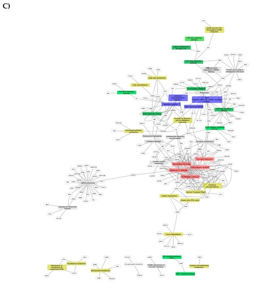 The Principal Component Analysis (PCA) plot of identified differentially expressed genes (DEG) was obtained through ClustVis [40]. miRNA targets of DEG were identified using Mienturnet [41]. LncRNAs of DEG were identified using LncRRIsearch [42] and Rtools CBRC [43]. Canonical pathway analysis was conducted using GeneTrial2 online database [44,45]. Networks were constructed and visualized using Cytoscape software (version 3.7.1) [46,47,48,49]. Data preparation was performed with the use of several R packages including splitstackshape [50], data.table [51], dplyr [52,53] and string [54,55]. Pathway networks were built for pathways enriched from a global pathway analysis, considering all omic layers components together.
