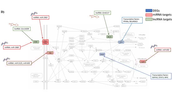 We also performed an integrated analysis of the Alzheimer’s disease pathway and identified TFs, protein-coding, and non-coding RNAs modulated by the HGD. Mitochondrial complex IV protein-coding DEG was up-regulated by the HGD and targeted by DNMT1 (DNA Methyl Transferase 1) transcription factor. Increased expression of complex IV has been observed in the hippocampus of AD patients [77], and DNMT1 expression is up-regulated in late-onset AD [78]. Alterations in mitochondrial function are also associated with diabetes [79]. Another example of a DEG up-regulated by the HGD was LRP1 (LDLR-related protein). Expression of LRP1 is increased in the hippocampus of AD patients [80], particularly in the microvasculature close to amyloid plaques in AD brains [81,82]. DE miRNA, miR-5125 was activated by the HGD and is known to target DKK1 (Dickkopf-1). Increased expression of DKK1 has been detected in the plasma and brain of AD patients and AD transgenic mice [83,84]. Another target of miR-5125 was LPL (Lipoprotein lipase). LPL accumulates in senile plaques [85], and its expression has been shown to be increased in the hippocampus of AD mice [86]. LncRNAs Gm6117 and Gm16339 were also up-regulated by the HGD and target NMDAR (N-methyl-D-aspartate receptor). An increase in NMDAR activity induces apoptosis and neurodegeneration in AD [87]. Yet another interesting pathway modulated by the HGD was the PI3K-Akt signaling pathway. Activation of the PI3K/Akt pathway promotes oxidative stress-mediated cell death [88]. Thus, our findings suggest that an HGD may be involved in previously defined Alzheimer’s disease-related pathways via deleterious effects on the brain microvasculature by promoting mitochondrial dysfunction, apoptosis, and neurodegeneration, and similar to the focal adhesion pathway, via up-regulation of pathway-associated TFs, protein-coding, and non-coding genes.