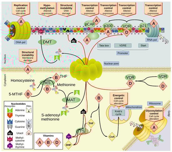 Overview of the impact of vitamins A, B complex, and D on the cellular biochemistry. The main effect of vitamin A, B complex, and D on cellular biochemistry is mostly due to the alteration of the transcriptional landscape of the cell, with relevant repercussions on the cell cycle. Vitamin A is involved in the replication and transcription processes but can also modulate the overall cellular expression by binding the transcription factor p300. Additionally, vitamin A modifies the genetic expression at the epigenetic level by modulating the histone acetyltransferase pCAF. Vitamin A is also involved in the glycosylation of proteins, in modulating important aspects of the cell cycle and cell-to-cell adhesion, and in the stability of the biological membranes. Vitamin B5 plays a relevant role in the metabolism of the cell, since it is incorporated in CoA that is involved in the Krebs cycle (TCA cycle) in the mitochondrial matrix. Additionally, vitamin B9 is converted to THF, which is then transformed into DHF by the enzyme TS simultaneously with the conversion of dU monophosphate into the methylated deoxythymidine monophosphate (Tme). In depletion of vitamin B9, the reaction is shifted toward the reagents with the consequent accumulation of dU instead of Tme in the DNA. Since dU is more susceptible to physicochemical insults than the canonical nucleotides, it can generate DNA strand breaks, the accumulation of which increase the mutation rate of the cell, fostering oncogenesis. Vitamin B9 is also involved in the biosynthesis, mediated by 5-MTHF and MAT of methylated cytosine (Cme), which is essential to the methylation of the DNA and the epigenetic modulation of the cellular expression. Deficiency in vitamin B9 is therefore associated with depletion of Cme and generalized hypomethylation. Vitamin D is bound by VDR that facilitates the translocation of the vitamin into the nucleus. The complex VDR/D binds to specific recognition sequences called VDREs within the promoters of several genes, including those involved in the regulation of the cell cycle (such as p21) and the epigenetic modulation (such as p300). CBP—CREB-binding protein; CoA—coenzyme A; CREB—cAMP response element-binding protein; DHF—dihydrofolate; DMT—DNA methyltransferase; DNA pol—DNA polymerase; dU—deoxyuridine; MAT—methionine adenosyl transferase; 5-MTHF—5-methyltetrahydrofolate; pCAF—p300/CBP-associated factor; RNA pol—RNA polymerase; TCA—tricarboxylic acid; THF—tetrahydrofolate; TS—thymidylate synthase; VDR—vitamin D recognition protein; VDRE—vitamin D response element.