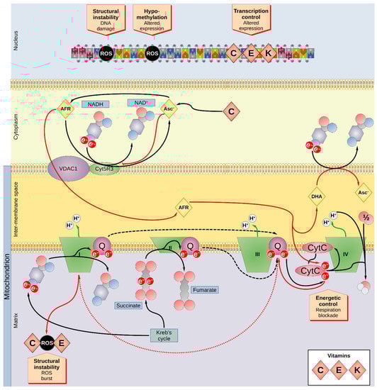Overview of the impact of vitamins C, E, and K on the cellular biochemistry. Vitamins C and E as well as most minerals affect the cellular biochemistry mainly by altering the oxidative status of the cells. Vitamin C is converted rapidly to Asc− and AFR. The Krebs cycle produces high energy molecules such as NADH, FADH2, ATP, or succinate. The Krebs cycle is linked to the respiration process that occurs mainly on the inner membranes of mitochondria, where several multiprotein complexes (I-IV) extract electrons from the high-energy molecules to pump protons (H+) into the intermembrane compartment of the mitochondria (third compartment of the figure). Protons are then pumped back into the cytoplasm producing ATP. In particular, complex I (NADH-ubiquinone oxidoreductase) oxidizes NADH to NAD+, and complex II (succinate-CoQ reductase) oxidizes succinate to fumarate, yielding FADH2. The acquired electrons are transferred to ubiquinone (also known as CoQ), which translocates them to complex III, which modulates the transfer of the electrons from CoQ to CytC, which then transfers them to complex IV (cytochrome c oxidase). Complex IV converts O2 to H2O in presence of H+. Under physiological conditions, the enzyme Cyb5R3 transfers one electron (e−) from NADH to AFR, producing Asc− and NAD+. An excess of Asc−, however, inhibits Cyb5R3 and the Cyb5R3-associated membrane pump VDAC1 transfers AFR into the intermembrane compartment, which then transfers an electron directly to CytC, blocking the respiratory process. Incapable of reaching complex IV, the electrons in the transfer chain proceed back to complex I, producing a burst of ROS (dotted red arrow). Furthermore, AFR is converted into DHA that is then reduced to Asc−, producing NAD+. The newly produced Asc− then further inhibits Cyb5R3 and the excess NAD+ can shift the balance of the reactions taking place in the Krebs cycle (red arrow). However, vitamins C and E act as scavengers neutralizing ROS. Vitamins C, E, and K can modulate the expression of several genes. ROS can directly damage the DNA chain, fostering oncogenesis, but can also influence the epigenetic control of genetic expression by inducing hypomethylation via 8-oxo-dG. AFR—ascorbyl free radical; Asc−—ascorbate; CoQ—coenzyme Q; Cyb5R3—NADH-cytochrome b5 oxidoreductase 3; CytC—cytochrome c; DHA—dehydroascorbate; e−—electron; FADH2—flavin adenine dinucleotide (reduced form); NADH—nicotinamide adenine dinucleotide (reduced form); 8-oxo-dG—8-oxo-deoxy-guanosine; ROS—reactive oxygen species; VDAC1—voltage-dependent anion-selective channel 1.