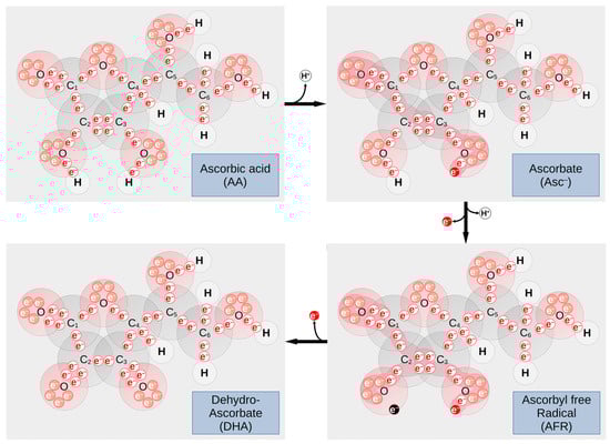 Vitamin C is a water-soluble vitamin present in fruits and vegetables. Most animals can produce vitamin C in the liver and kidney, but due to a mutation in the L-gulonolactone oxidase humans rely on diet for its intake []. The protonated form of vitamin C is ascorbic acid (AA). Physiologically, vitamin C acts as a scavenger for radicals (e.g., hydroxyl OH− or superoxide O2−), thus generating ascorbyl free radical (AFR) and hydrogen peroxide (H2O2) or water, respectively, or as a reducing cofactor (electron donor) in Cu(I)-dependent monooxygenases or Fe(III)-dependent dioxygenase reactions, as in prolyl- and lysyl-hydroxylases during collagen synthesis. Vitamin C donates its electrons sequentially, becoming first AFR and then dehydroascorbic acid (DHA) (Figure 3) []. As vitamin C is involved in the oxidative state of the cells, it can have an effect on the cells by damaging cellular structures (such as membranes and DNA) and impairing biochemical pathways. Both impairments aid in the insurgence of cancer.