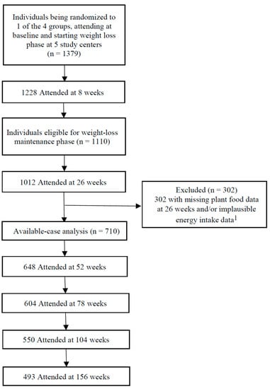 Participant flow diagram. 1 Individuals with missing plant food data at 26 weeks and/or implausible energy intake data (<2520 or >14,700 kJ·day−1 for women and <3360 or >17,640 kJ·day−1 for men) were excluded.