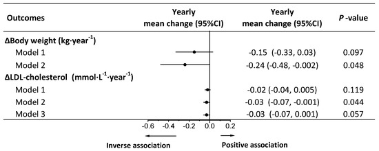 Total grains and potatoes were not associated with any health outcomes in models 2 and 3 (Table S3). Legumes were positively associated with an increase in HDL cholesterol, whereas after adjustment for weight change, the association was lost (Figure 3). No associations were observed between legumes and weight regain or other cardiometabolic risk factors in models 2 and 3 (Table S4). Nuts were inversely associated with increments in BW, FM, HbA1c, total cholesterol, and LDL cholesterol in model 2. After adjustment for weight change, the association of nuts with HbA1c was lost (Figure 3). No associations were observed between nuts and other cardiometabolic risk factors in models 2 and 3 (Table S5).