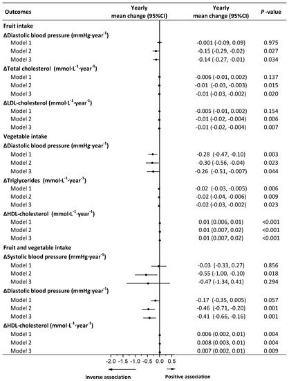 In the available analysis, fruits were inversely associated with increments in DBP, total cholesterol, and LDL cholesterol after adjustment for weight change in model 3 (Figure 4). No associations were observed between fruits and weight regain or other cardiometabolic risk factors in models 2 and 3 (Table S6). Vegetables were inversely associated with DBP and triglycerides and were positively associated with HDL cholesterol, independent of weight change in model 3 (Figure 4). No associations were observed between vegetables and weight regain or other cardiometabolic risk factors in models 2 and 3 (Table S7). Combined vegetable and fruit intake was inversely associated with an increment in SBP, and DBP and was positively associated with an increase in HDL cholesterol in model 2, whereas after adjustment for weight change, only the associations of DBP and HDL cholesterol with combined vegetable and fruit intake remained significant in model 3 (Figure 4 and Table S8).