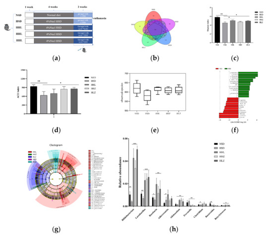 L. plantarum ZDY2013 and LGG can alleviate weight loss and intestinal flora disorders caused by high-salt diets. (a) A mouse model of chronic renal injury induced by a high-salt diet. (b) Petal figure, different colors represent different groups and numbers represent the number of OTUs between the two groups. (c) Shannon index. (d) ACE index. (e) Unweighted UniFrac beta distance analysis of beta-diversity between groups. (f) LDA Score, different colors represent different groups and the length of the bar chart represents the size of the LDA value. (g) Cladogram, different colors represent different groups, circles represent classification levels from phylum to genus (or species), and small circle diameters are proportional to relative abundance. The red node represents the microorganism group that plays an important role in the red group, the green node represents the microorganism group that plays an important role in the green group, and the yellow node represents the microorganism group that does not play an important role in both groups. (h) Histogram of relative abundance of some major bacterial genera. NSD: normal diet group; HSD: 4% high-NaCl diet group; HHL: after a long-term high-salt diet, mice were given 200 µL 1 × 1010 CFU/mL L. rhamnose by gavage every day; HHZ: after a long-term high-salt diet, mice were gavage with 200 µL 1 × 1010 CFU/mL L. plantarum ZDY2013 every day; HLZ: after a long-term high-salt diet, mice were gavage with 200 µL 1 × 108 CFU/mL L. plantarum ZDY2013 every day. All data are presented as mean ± SD. * p < 0.05; ** p < 0.01; *** p < 0.001.
