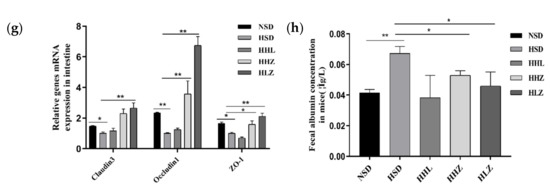 To detect the changes in the intestinal permeability of mice, we measured the concentration of fecal albumin and the mRNA expression levels of intestinal tight junction proteins tjp1, ocln, and cldn-3 in mice. Compared with the NSD group, the mRNA expression levels of tjp1, ocln, and cldn-3 were downregulated in the HSD group, while the mRNA expression levels of these proteins were upregulated after treatment with L. plantarum ZDY2013 and LGG. Notably, the upregulated expression level in the HLZ group was higher than that of the HHZ group and the HHL group, and closer to the NSD group (Figure 2g). Moreover, the content of fecal albumin in the HSD group was significantly higher than that of the NSD group, while the content of fecal albumin in the treated group was reduced and the HLZ group was closer to the NSD group than the HHL and HHZ groups (Figure 2h). These results indicated that HSD damaged intestinal barrier function while L. plantarum ZDY2013 and LGG treatment alleviated intestinal barrier function, among which the HLZ group had the best alleviating effect.