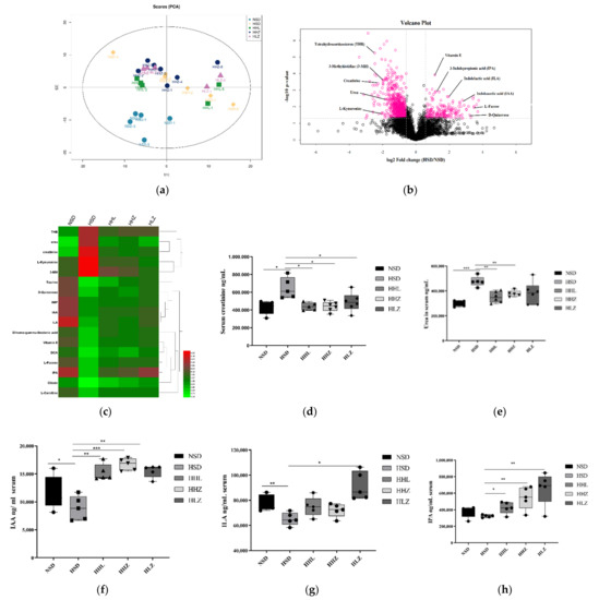 Lactobacillus plantarum ZDY2013 can reduce the concentration of urinutoxin increased by HSD. (a) Positive and negative ion mode samples of PCA score. (b) Volcanic positive ion mode (Volcano Plot), the red dots are differential metabolites screened by univariate statistical analysis. (c) Clustering heat map of metabolites with partial significant differences in different groups. (d) Serum creatinine concentration in different groups. (e) Serum urea concentration in different groups. (f–h) Serum IAA, ILA, and IPA concentration in different groups. THB: tetrahydrocorticosterone; PAA: phenylacetic acid; IAA: indoleacetic acid; ILA: indolelactic acid; IPA: indolepropionic acid; DCA: deoxycholic acid; IMP: inosine 5′-monophosphate; HPAA: hydroxyphenylacetic acid. All data are presented as mean ± SD. * p < 0.05; ** p < 0.01; *** p < 0.001. Square: HSD group; circle: NSD group; triangle: HHL group; upside down triangle: HHZ group; rhombus: HLZ group.