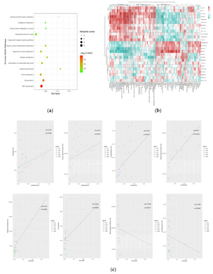 For data processing, the original data were converted into. mzXML format by ProteoWizard, and then the XCMS program was used for peak alignment, retention time correction, and peak area extraction [25]. Accurate mass number matching (<25 PPM) and second-order spectrum matching were carried out through the retrieval of the laboratory and built database. Multidimensional statistical analysis was performed on the data after pareto-scaling pretreatment, including unsupervised principal component analysis (PCA), supervised partial least squares discriminant analysis (PLS-DA), and orthogonal partial least squares discriminant analysis (OPLS-DA). One-dimensional statistical analysis included Student’s t-test variance analysis, and R software to draw a volcano map.