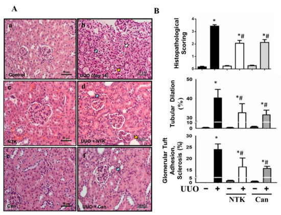 Effects of Nootkatone treatment on the renal pathological changes in a UUO mouse model. Vehicle, Nootkatone (NKT), or candesartan (Can; positive control) was orally given to the sham or UUO mice for 14 days. (A) The pathological changes were determined by hematoxylin and eosin (H&E) staining. The kidney injury features, including kidney tubular dilation (yellow arrow), interstitial infiltration (blue arrow), and glomerular tuft adhesion and sclerosis (white arrow) were indicated. Scale bar: 50 μm. (B) The histopathological scoring is shown Data are presented as mean ± SD (n = 6). * p < 0.05 vs. the sham control group. # p < 0.05 vs. the UUO group.