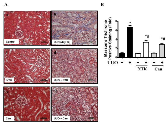 Effects of Nootkatone treatment on the collagen deposition in the kidneys of UUO mice. Vehicle, Nootkatone (NKT), or candesartan (Can; positive control) was orally given to the sham or UUO mice for 14 days. Collagen deposition was determined by Masson’s Trichrome staining (A). a, Control; b, UUO; c, NTK; d, UUO+NTK; e, Can; f, UUO+Can. Scale bar: 50 μm. The quantification is shown in (B). Data are presented as mean ± SD (n = 6). * p < 0.05 vs. the sham control group. # p < 0.05 vs. the UUO group.