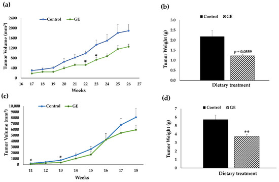 3.1. Dietary GE Inhibited TNBC Growth in PDX Models