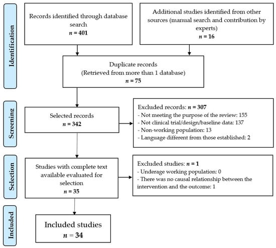 After filtering the 75 repeated records and applying the inclusion and exclusion criteria (Figure 1), 34 clinical trials [,,,,,,,,,,,,,,,,,,,,,,,,,,,,,,,,,] were selected for review and critical analysis (see Table 1).