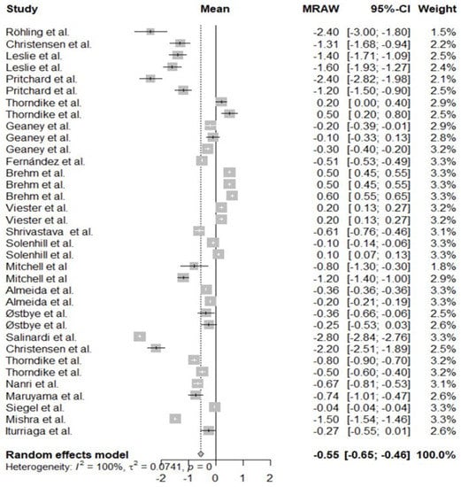 The mean body mass index (BMI) in the intervention group fluctuated between a minimum of 23.8 ± 3.5 in the study by Iturriaga et al. [] and a maximum of 39.4 ± 6.9 in the study by Barham et al. []. There were four clinical trials that did not report BMI: Shrivastava et al. [] only indicated the percent of obese individuals; Follick et al. [] only included the percent of overweight individuals; Baer [] only reported weight in kilograms and Ferdowsian et al. [] did not report any measure related to BMI.