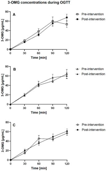 | 3-OMG iAUC120 [µg × min/mL] | Pre-intervention | 4305.39 ± 530.82 | 3982.21 ± 363.71 | 4202.44 ± 318.09 |