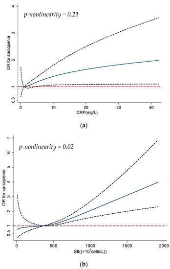 (a) Dose–response curve for association between CRP and sarcopenia; the solid line shows the odds ratios (ORs), and the dotted line represents the 95% confidence intervals. CRP = 1.2 mg/L was used as the reference in the curve. Abbreviations—CRP: C-reactive protein. (b) Dose–response curve for association between SII and sarcopenia; the solid line shows the odds ratios (ORs), and the dotted line represents the 95% confidence intervals. SII = 365.7 × 109 cells/L was used as the reference in the curve. Abbreviations—SII: systemic immune-inflammation index.