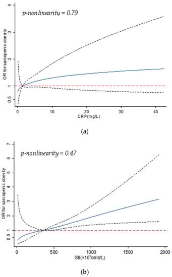 (a) Dose–response curve for association between CRP and sarcopenic obesity; the solid line shows the odds ratios (ORs), and the dotted line represents the 95% confidence intervals. CRP = 1.2 mg/L was used as the reference in the curve. Abbreviations—CRP: C-reactive protein. (b) Dose–response curve for association between SII and sarcopenic obesity; the solid line shows the odds ratios (ORs), and the dotted line represents the 95% confidence intervals. SII = 365.7 × 109 cells/L was used as the reference in the curve. Abbreviations—SII: systemic immune-inflammation index.