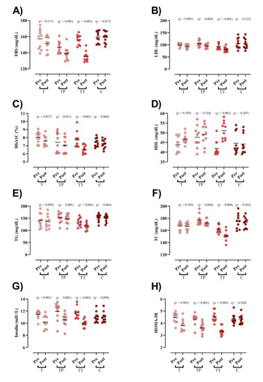 Baseline concentration of blood markers did not differ between groups except for FBS and TC. FBS was significantly reduced in both TP and TT groups (TP = −7.8 mg/dL (95% CI = −5 to −10.6; p < 0.001), TT = −21 mg/dL (95% CI = −15 to −27; p < 0.001), Figure 2A). LDL (T = −5.8 mg/dL (95% CI = −3 to −8.6; p = 0.001), TP = −10.4 mg/dL (95% CI = −4.6 to −16.3; p = 0.003), and TT = −11.4 mg/dL (95% CI = −8.9 to −13.9; p < 0.001), Figure 2B), HbA1c (T = −0.4 mg/dL (95% CI = −0.06 to −0.8; p = 0.027), TP = −0.3 mg/dL (95% CI = −0.6 to −0.1; p = 0.011), and TT = −1.1 mg/dL (95% CI = −0.6 to −1.7; p = 0.001), Figure 2C), TG (T = −5.5 mg/dL (95% CI = −2.6 to −8.3; p = 0.002), TP = −5.2 mg/dL (95% CI = −2.9 to −7.5; p = 0.001), and TT = −16.5 mg/dL (95% CI = −11.7 to −21.3; p < 0.001), Figure 2E), insulin (T = −1.2 mIU/L (95% CI = −0.65 to −1.91; p = 0.001), TP = −1.3 mIU/L (95% CI = −0.74 to −2; p = 0.001), and TT = −1.7 mIU/L (95% CI = −1.3 to −2; p < 0.001) Figure 2G), and HOMA-IR (T = −0.6 (95% CI = −0.35 to −0.94; p = 0.001), TP = −0.7 (95% CI = −0.43 to −0.98; p < 0.001), and TT = −1.1 (95% CI = −0.98 to −1.37; p < 0.001) Figure 2H) were significantly decreased following all interventions. HDL was significantly increased only in TT (9.1 mg/dL (95% CI = 12.7 to 5.6; p < 0.001), Figure 2D). Lastly, TC was significantly decreased in both TP (−5.1 mg/dL (95% CI = −2.1 to −8.2; p = 0.004)) and TT (−11.3 mg/dL (95% CI = −4.7 to −17.9; p = 0.004), Figure 2F) groups. ANCOVA results showed that the declines in FBS and LDL changes were significantly greater in the TT compared to those in the T and C groups. Moreover, the TP experienced greater drops in FBS and LDL than the C group. Changes in HbA1c, TG, HDL, and TC were significantly greater in the TT compared to all other groups. In addition, decreases in insulin concentrations were significantly greater in all experimental groups compared to C; however, no between group differences were observed between TT, TP, and T. With regard to HOMA-IR, decreases in TT were significantly greater than all other groups (Table 3).