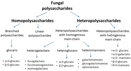 Heteropolysaccharides, among them, heteropolysaccharides with a homogeneous main chain (heterogalactans, heteroglucans, and heteromannans) and heteropolysaccharides with a heterogeneous main chain, are a more diverse group of biologically active polysaccharides [17]. Due to the structure of the basic chain of these compounds, they are divided into mannans, xylans, galactans, and fructans. The side chains of these macromolecules may include arabinose, fructose, mannose, galactose, or glucose [17,19,21,22,23,24]. Figure 1 shows the classification of fungal main polysaccharides.