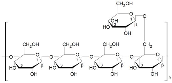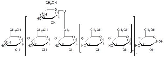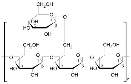 Pleuran is 1,3-1,6-β-glucan extracted from Pleurotus ostreatus and sold as a dietary supplement under the commercial name Immunoglukan. The basic unit of this polysaccharide consists of four glucose molecules connected by β-1-3-glycosidic bonds, and every fourth glucose unit is linked by a side chain with a β-1-6-glycosidic bond (Figure 6). The molecular weight of pleuran is between 600,000 and 700,000 Da [49].