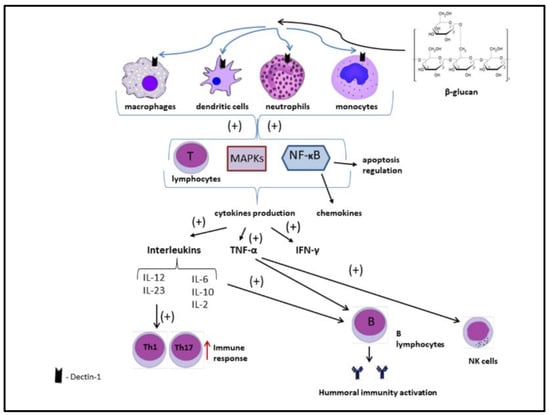Beta-glucans bind to dectin-1 receptors located on macrophages, dendritic cells, neutrophils, and monocytes. This combination results in the activation of many compounds responsible for the immune response, including, among others, nuclear factor kappa-B (NF-κB). When NF-κB is activated, it imports to nucleus and binds specific DNA sites. In the signaling pathway, NF-κB is downstream of mitogen-activated protein kinases (MAPKs). Additionally, T lymphocytes are stimulated. Chemokines and cytokines, including interleukins, interferon-γ (IFN-γ), and tumor necrosis factor alpha (TNF-α), are released. As a result, the cellular and humoral response of the immune system is enhanced [6,8,91].