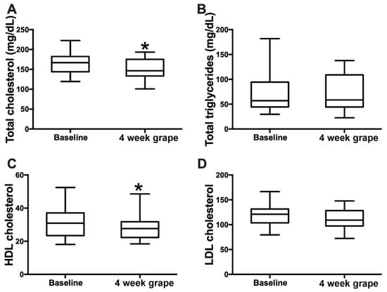 Effects of 4 weeks’ grape powder intake on serum (A) total cholesterol, (B) total triglycerides, (C) high-density lipoprotein (HDL) cholesterol and (D) low-density lipoprotein (LDL) cholesterol. * p < 0.05.
