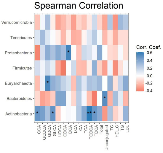 Spearman correlations were calculated and plotted as a heatmap between the changes in serum lipids, BA levels, and gut microbes at the phylum level, after 4 weeks of grape powder intake (Figure 3). The changes in the relative abundance of Proteobacteria, Euryarchaeota, and Bacteroidetes were positively correlated with the changes in serum DCA, GDCA, and the ratio of unconjugated BAs to total Bas, respectively. The changes in the relative abundance of Actinobacteria were positively correlated with four out of seven conjugated BAs (GCA, GLCA, TCDCA, and TDCA). No significant correlation was detected between the changes in serum triglycerides, cholesterol, HDL cholesterol, LDL cholesterol, and microbial phyla (data not shown).