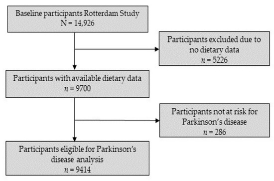 The baseline cohort of the Rotterdam Study consisted of 14,926 participants (RS-I: 7983, RS-II: 3011, RS-III: 3932). From this group, dietary data were available for 9788 participants. Based on previous studies, we determined a reported energy intake of less than 500 kcal/day or more than 5000 kcal/day as unreliable and, therefore, excluded 88 participants [25]. From the remaining 9700 participants with reliable and available dietary data, participants with prevalent parkinsonism or PD (n = 51), without a screening for parkinsonism at baseline (n = 174) or who did not give consent for parkinsonism follow-up (n = 61), were excluded. This resulted in a final eligible cohort of 9414 participants for the current study. The flowchart of study participants can be found in Figure 1.