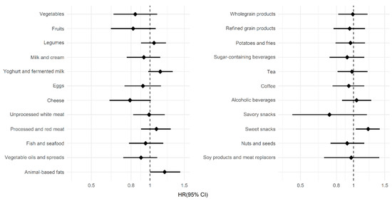 Associations between the food groups and Parkinson’s disease. The hazard ratios (HR), shown as diamonds, and the 95% confidence interval (CI), shown as lines, were obtained using Cox proportional hazard models. Hazard ratios are shown per standard deviation increase in intake for the 23 food groups, which were also used in the principal component analysis.