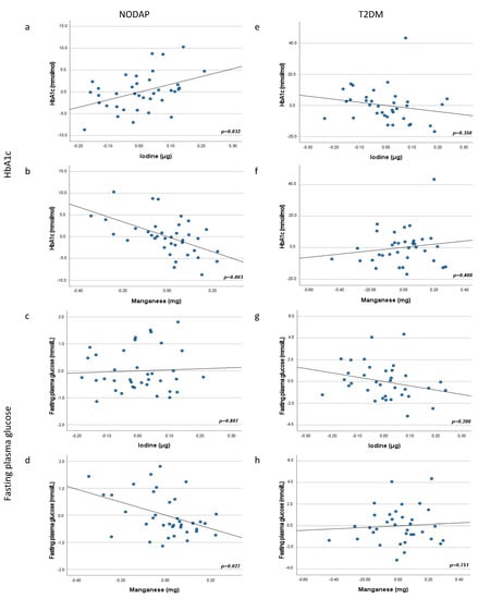 Associations between iodine and manganese intake and markers of glucose metabolism in NODAP (a–d) and T2DM (e–h). Abbreviations: NODAP = New-onset diabetes or prediabetes after acute pancreatitis. T2DM = Type 2 diabetes or prediabetes prior to acute pancreatitis. HbA1c = glycated haemoglobin. Iodine and manganese data were log transformed. Partial regression plots were adjusted for age, sex, daily energy intake, V/S fat volume, alcohol intake, smoking status, aetiology of AP, number of AP episodes, cholecystectomy, use of antidiabetic medications. Significance was set at p < 0.05.