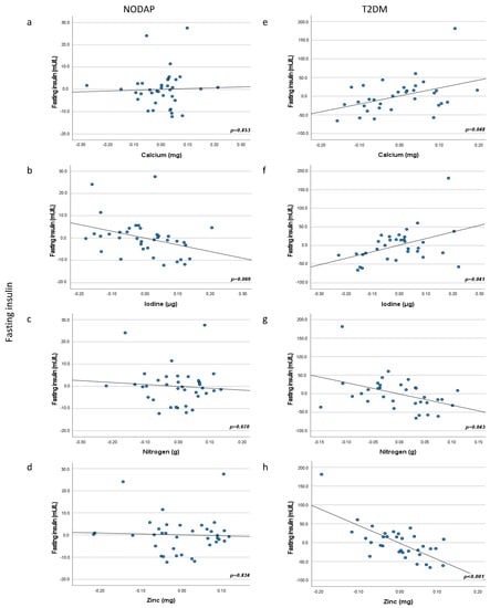 Associations between calcium, iodine, nitrogen, and zinc intake and fasting insulin in NODAP (a–d) and T2DM (e–h). Abbreviations: NODAP = New-onset diabetes or prediabetes after acute pancreatitis. T2DM = Type 2 diabetes or prediabetes prior to acute pancreatitis. HbA1c = glycated haemoglobin. Calcium, iodine, nitrogen, and zinc data were log transformed. Partial regression plots were adjusted for age, sex, daily energy intake, V/S fat volume, alcohol intake, smoking status, aetiology of AP, number of AP episodes, cholecystectomy, use of antidiabetic medications. Significance was set at p < 0.05.