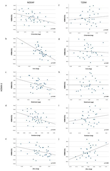 Associations between chloride, iron, selenium, sodium, and zinc intake and HOMA-S in NODAP (a–e) and T2DM (f–j). Abbreviations: NODAP = New-onset diabetes or prediabetes after acute pancreatitis. T2DM = Type 2 diabetes or prediabetes prior to acute pancreatitis. HbA1c = glycated haemoglobin. Chloride, iron, selenium, sodium, and zinc data were log transformed. Partial regression plots were adjusted for age, sex, daily energy intake, V/S fat volume, alcohol intake, smoking status, aetiology of AP, number of AP episodes, cholecystectomy, use of antidiabetic medications. Significance was set at p < 0.05.