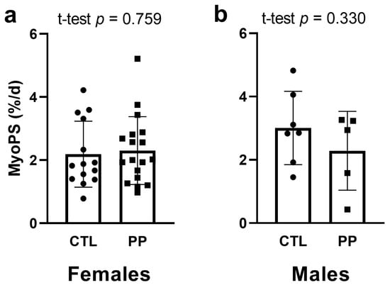 For females, no significant difference existed for the 24-h integrated MyoPS response 24 h following the first bout of training between PP and CTL groups (p = 0.759) (Figure 3a). Similarly, no significant difference existed for the 24-h integrated MyoPS response 24 h following the first bout of training between PP and CTL male participants (p = 0.330) (Figure 3b).