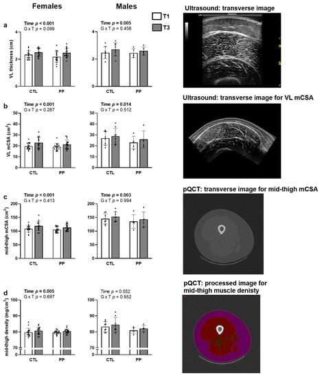 For females, a supplement × time interaction trended for vastus lateralis thickness (p = 0.099; Figure 5a), but no significant interaction effects existed for vastus lateralis mCSA (p = 0.267; Figure 5b), mid-thigh mCSA (p = 0.413; Figure 5c), or mid-thigh muscle density (p = 0.697; Figure 5d).