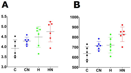 As expected, the body weight of H rats was higher than C rats (Table 2). The body weight of HN rats was not different from H rats, while the CN rats were heavier than C rats. Lean mass was not different between C and H rats. For CN and HN rats, the lean mass was higher than their respective controls. Bone mineral content was higher in H and HN rats compared to C and CN rats. Bone mineral density of H rats was higher than that of C rats. The bone mineral density of CN and HN rats was not different from the respective controls. Food intake was higher in C rats compared to H rats. CN rats had lower food intake than C rats. HN rats had similar food intake to H rats. Water intake was higher in H rats compared to C rats and further increased in CN and HN rats, but this increase with N. oceanica intervention was not associated with an increased energy intake; these changes may be caused by the increased salt or protein intake. Energy intake was highest in H rats compared to C rats. HN rats had similar energy intake as H rats. CN rats had the lowest energy intake (Table 2).