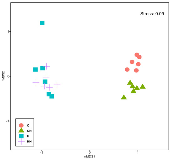 Non-metric multi-dimensional scaling plot of bacterial gut communities. C, rats fed with corn starch diet; CN, rats fed with corn starch diet + Nannochloropsis oceanica; H, rats fed with high-carbohydrate, high-fat diet; HN, rats fed with high-carbohydrate, high-fat diet + Nannochloropsis oceanica.