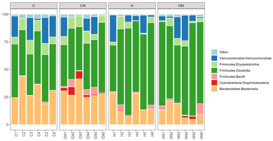 Taxonomic profiles of bacterial communities of all faecal samples shown at the class level. C, rats fed with corn starch diet; CN, rats fed with corn starch diet + Nannochloropsis oceanica; H, rats fed with high-carbohydrate, high-fat diet; HN, rats fed with high-carbohydrate, high-fat diet + Nannochloropsis oceanica.