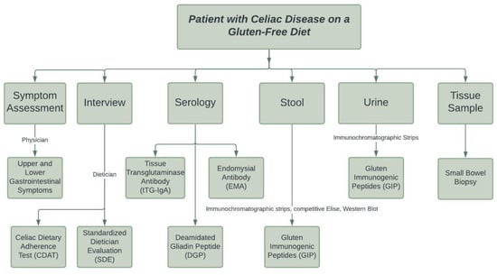 Strict adherence to a gluten-free diet is the only recommended treatment for CD []. As such, one may suggest that newly diagnosed and symptomatic patients require more frequent assessment, especially as the gut mucosa is undergoing repair and clinical symptoms are improving. Several studies have investigated when patients should be followed up after initiating a GFD and with whom, given that there is no clear consensus. In a study examining patient preferences towards follow-up, most preferred to be seen by a dietician (with a physician available if needed), and 67% of respondents preferring annual appointments []. Kurppa et al. [] found that follow-up by primary care physicians was just as successful as a follow-up in tertiary centers, with average GFD adherence rates at 88%. Current guidelines recommend routine blood tests at each follow-up visit, including checking for intestinal absorption with a complete blood count, serum calcium, ferritin, vitamin B12, and alkaline phosphate. In addition, thyroid function tests such as thyroid-stimulating hormone and thyroid hormone should be checked to screen for other autoimmune conditions, alongside liver function tests such as aspartate aminotransferase and alanine aminotransferase levels to monitor for autoimmune liver disease []. While there are no strong recommendations towards a particular monitoring tool, there are several methods for monitoring gluten-free diet adherence and efficacy in CD, including symptom assessment, dietetic interview, serology, stool and urine markers, and small bowel biopsy (Figure 1).