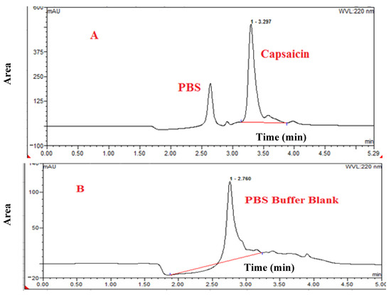 HPLC spectrum of (A): CAP loaded inside nanoliposomes, (B): PBS buffer blank hydration media.