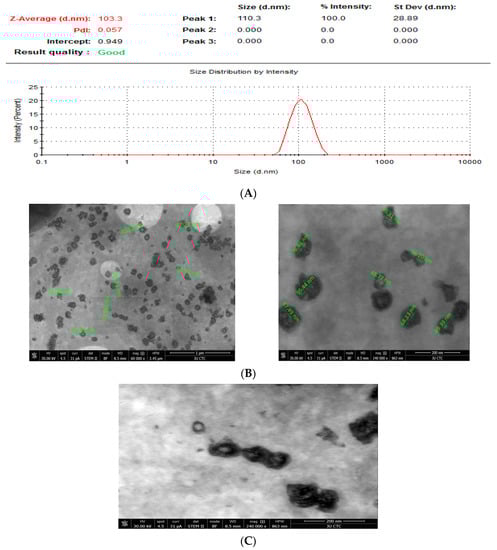 (A) Size distribution of CAP-loaded nanoliposomes by DLS; (B) TEM Shape and Size (CAP-loaded nanoliposomes); (C) Morphology (CAP-loaded nanoliposomes).