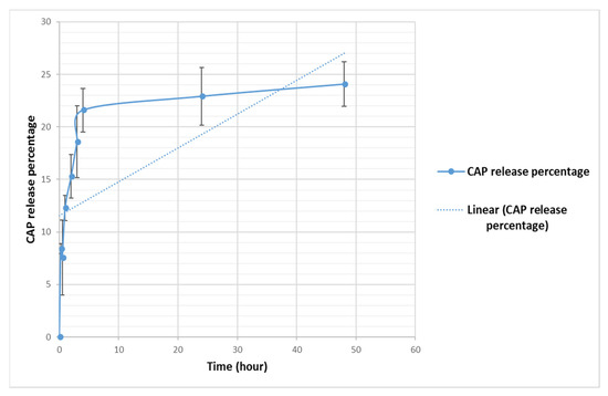 In vitro release of CAP from CAP-loaded nanoliposomes, monitored over 48 h at 37 °C. All values represent the average ± SD of three independent experiments.