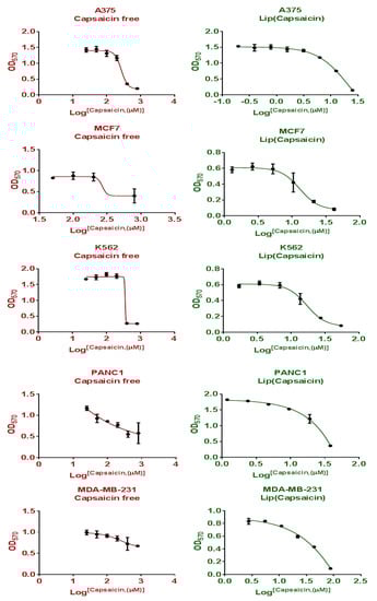 The toxicity of CAP-loaded nanoliposomes was investigated against human fibroblasts as negative control; IC50 value of CAP-loaded nanoliposomes against normal fibroblast cells showed higher value than human cancer cell lines (MCF7, MDA, A375, K562 and PANC-1) with 4.9, 1.7-, 5.0-, 3.7-, and 2.9-fold increase, respectively, and increased the selectivity of CAP nanoliposomes against cancer cells in comparison with free CAP. This was thought to be due to increased bioavailability of poorly water-soluble CAP, increased cytotoxicity of CAP, and the fact that nano-liposome exhibited a slower release behavior, which prevented the burst release of the drug and reduced its hemolytic toxicity, and relevant antitumor activities [35]. Therefore, CAP-loaded nanoliposomes showed improvement in capsaicin’s anticancer activity and selectivity. These results were compatible with previous studies as liposomal formulations increase drug accumulation in tumor cells as well as intracellular drug retention, in vitro and in vivo [24].