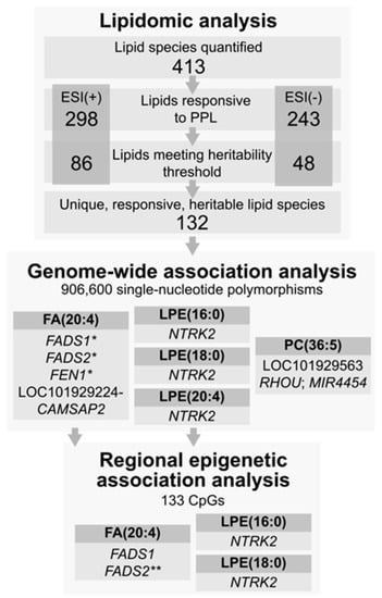 Genetic Analysis: PPL response was defined as the change or delta in the lipidomic trait value from the fasting value. Each delta was inverse rank-based transformed. We used linear regression implemented in PLINK (v1.9) for detecting the association between SNP genotypes and lipidomic trait outcomes. Covariates included age, gender, study site, and fasting lipidomic concentration. As population substructure within GOLDN is minimized by the design (Caucasian families from MN and UT), we did not adjust for ancestry. Inflation corrected p-values are presented in Manhattan and QQ plots in Supplemental Files. In sensitivity models for the top hits, the family structure was modeled as a random effect by using the LMEKIN R package [48]. We followed up the top GWAS findings (p < 1.0 × 10−7) with a regional analysis of cytosine-phosphate-guanine sites (CpGs, annotated to the GWAS SNP gene location or a ±20 kb region around the SNP, if intergenic). For epigenetic association, we took a two-step approach. We first obtained the residuals from a model regressing four methylation principal components (PCs) onto the CpG. We then regressed the CpG residual onto the PPL response trait, adjusting for the same covariates as in the GWAS. For CpGs with association p-value with the lipid trait of interest <0.01, we examined meQTLs. For meQTL analysis, we regressed the nearest GWAS SNP onto the CpG, adjusting for age, sex, and methylation PCs. For top findings from the CpG analysis qualifying as a meQTL (p < 10−9 based on prior work in GOLDN) [49], mediation analysis was used to determine if the association between the GWAS SNP and lipid was mediated by the CpG. Mediation analysis was performed in SAS, version 9.4 (SAS Institute Inc. Cary, NC, USA). The models were adjusted for age, sex, center, and baseline/fasting lipid. Replication analysis in HAPI Heart for 8 of the top SNPs was performed similarly to GOLDN where each SNP was regressed on the inverse normally transformed lipid change adjusting for age, sex, baseline level, and genetic relationship matrix using Mixed Model Analysis for Pedigree and population (MMAP) (https://github.com/MMAP DOI:10.5281/zenodo.5033491, accessed on 27 July 2021).