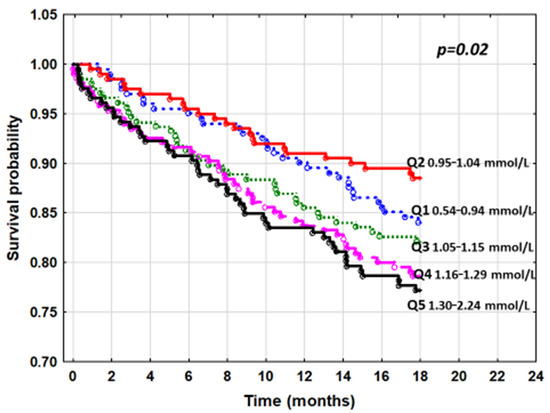 The cumulative probability of death represented by the Kaplan–Meier curves also showed significant differences between the sP quintiles (p = 0.02) (Figure 1).
